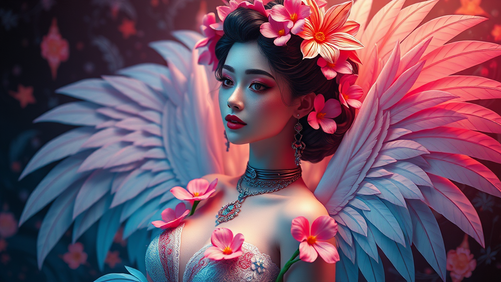 A mesmerizing digital painting inspired by the paper craft style, portraying a voluptuous concubine adorned with feathers and flowers. This piece draws influence from the works of Ernst Haeckel and Maria Sibylla Merian, blending the surrealistic touches of Tristan Eaton, Victo Ngai, Artgerm, and Rhads with the vibrant colors and neon lights of sci-fi. The artistic essence of Ross Draws, Kaethe Butcher, Hajime Sorayama, Greg Tocchini, and Virgil Finlay can be seen in the intricate details and captivating atmosphere. Designed by Ilya Kuvshinov, the artwork is in stunning 8k UHD HDR, capturing the ethereal beauty with a futuristic flair. The composition maintains an organic flow, leaving behind the flaws of duplication, mutation, or unnatural features, ensuring a clear and high-resolution finish devoid of low-quality artifacts or distractions like watermarks and text elements. The artwork stays within frame and crisply delivers its colorful and enchanting character.