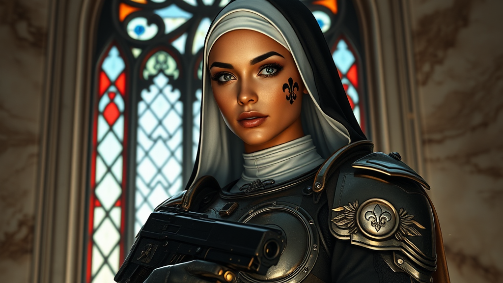 Full body shot of a stunning woman in sci-fi nun armor, resembling a sister of battle, holding a bolt pistol, standing before a stained glass window. She has tanned skin, a distinctive fleur de lys face tattoo, and wax seals adorning her armor. Her face is symmetrical and detailed, with reflective eyes highlighted by dark eyebrows, mascara, and makeup. The scene boasts intricate detail with dramatic lighting, including chiaroscuro and rim lighting, set against marble walls with dust particles in the air. The style is reminiscent of a majestic professional oil painting, inspired by masters like Waterhouse, John Constable, and contemporary influences such as Jeremy Mann and Greg Manchess. The image is detailed and high in intricacy, trending on platforms like ArtStation and CGSociety, capturing the spirit of impressionism and the flair of Studio Ghibli, yet avoiding elements like extra limbs, mutated features, and disfigurement.