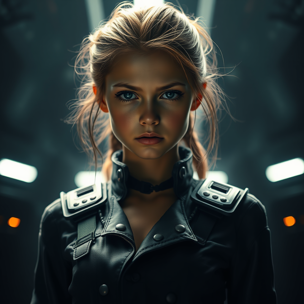 Three-quarter close-up portrait of a stunningly beautiful young girl with a slender athletic figure and a striking face, showcasing a combat sci-fi jumpsuit reminiscent of Battlestar Galactica style from the 90s. She wears a frown with an innocent expression, while her hair is styled with attention to detail. The scene is set against a deep space backdrop with an oppressive, contrasting atmosphere that enhances the drama. The background incorporates backlighting, creating a dramatic and expressive, yet gloomy horror atmosphere. The cinematic shot, photographed from a lower angle with a Canon EOS 5D Mark IV DSLR at an aperture of f/8, shutter speed 1/250 sec, and ISO 100, captures the hyper photorealistic textures with natural reflections and cinematic lighting. The elements include bright, blinding lights, and hints of gold and rivets adding to the sci-fi aesthetics. Keeping the core concept intact, these attributes are creatively accentuated without unnecessary distortions or errors in proportions, ensuring a compelling and visually captivating portrayal.