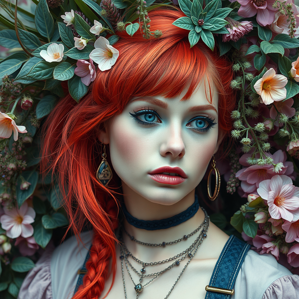 Portrait of a Victorian 80s punk woman with vibrant red hair, accentuated by soft pastel colors intertwined with lush plants and delicate flowers, inspired by the style of Tom Bagshaw, featuring a unique blend of vintage elegance and rebellious spirit. The scene has a harmonious balance between the natural elements and the edgy, bold character, creating a striking yet whimsical contrast. The woman’s punk attire offers a nod to her daring personality, adding layers of intrigue and charm to the composition.