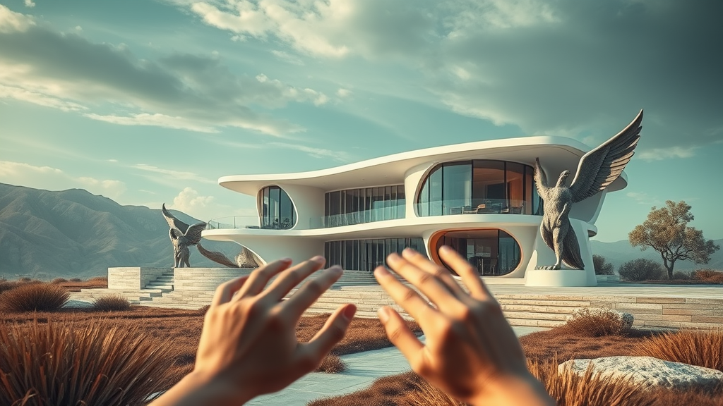 Futuristic luxury home nestled in an abstract landscape, featuring sleek architectural lines and high-tech elements; the scene includes statues with shadowy, wing-like structures, and a slightly distorted, dreamlike quality with hints of blurred and fuzzy textures, imperfect hands subtly blending into artistic tiling patterns that add a surreal touch to the overall ambiance.