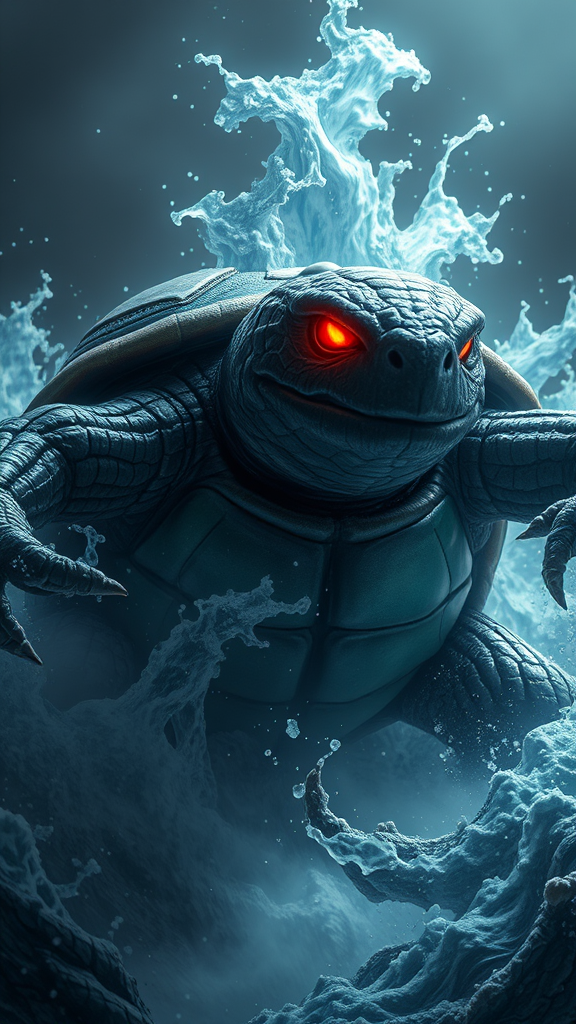 Unleashing wrathful dark Pokemon Blastoise, a colossal turtle beast, erupting with unstoppable torrents of water, saturated, intense, warped, grim, and sinister, featuring an elaborate and complex design with precise details, striking lighting, lifelike realism, photorealistic quality, cinematic impact, 8k resolution, aspect ratio 9:16, version 5, offering a hauntingly mesmerizing vision.