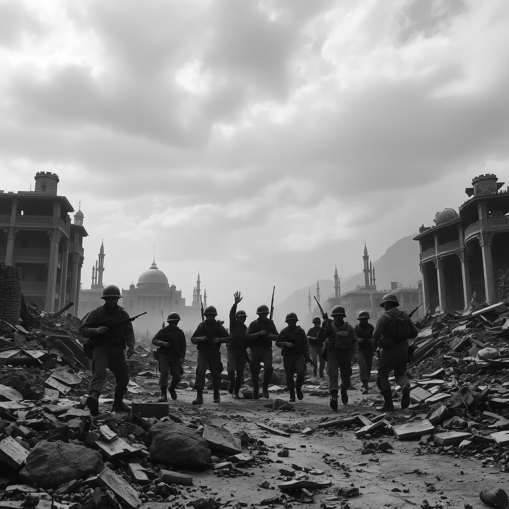 In the aftermath of a fierce battle, a determined group of soldiers rally together amidst the ruins of a war-torn city, their camaraderie and resilience shining through the monochrome landscape.