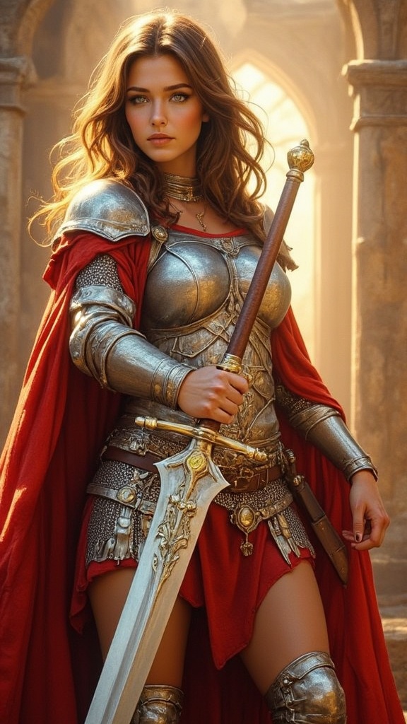 Super-hero, lady Knight, paladin for the 21St century. Feminine Caucasian female, tall, athletic, statuesque, strong, beautiful. Dark brown medium shoulder-length hair, side parted and coily curls. Bluish-grey eyes, kind and intelligent. Silver sun/solar symbol necklace with golden topaz gemstone at the center. A Scarlet red silky shirt, long sleevedand form fitting. A silver pauldron and breastplate on the right side of her body, intricately detailed with solar symbols. Shiny silver bracers on her arms, gauntlets on her hands. A wide silver belt around her waist, a golden topaz gemstone inside a sun symbol as the belt buckle. A wide shiny chainmail loincloth that reaches above the knees. Knee-high silver boots with silver knee pads. She wears a long flowing Scarlet red cape that is clasped at her collarbone. She weilds a gigantic silver battlesword that is carved with delicate solar symbols on the hilt. She is surrounded by a glowing golden aura and a bright halo of light around her head, the light around her head shines like the sun. Not only is she great in battle, she can use holy magic to bless herself or others. She can use this power to heal, repel evil and many other things. She is a representation and living warrior for all that is good. Full body pose, weikding her sword to keep the darkness at bay.