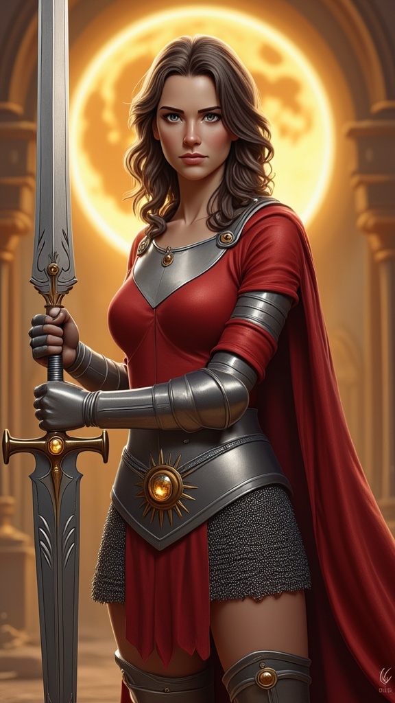 Super-hero, lady Knight, paladin for the 21St century. Feminine Caucasian female, tall, athletic, statuesque, strong, beautiful. Dark brown medium shoulder-length hair, side parted and coily curls. Bluish-grey eyes, kind and intelligent. Silver sun/solar symbol necklace with golden topaz gemstone at the center. A Scarlet red silky shirt, long sleevedand form fitting. A silver pauldron and breastplate on the right side of her body, intricately detailed with solar symbols. Shiny silver bracers on her arms, gauntlets on her hands. A wide silver belt around her waist, a golden topaz gemstone inside a sun symbol as the belt buckle. A wide shiny chainmail loincloth that reaches above the knees. Knee-high silver boots with silver knee pads. She wears a long flowing Scarlet red cape that is clasped at her collarbone. She weilds a gigantic silver battlesword that is carved with delicate solar symbols on the hilt. She is surrounded by a glowing golden aura and a bright halo of light around her head, the light around her head shines like the sun. Not only is she great in battle, she can use holy magic to bless herself or others. She can use this power to heal, repel evil and many other things. She is a representation and living warrior for all that is good. Full body pose, weikding her sword to keep the darkness at bay.