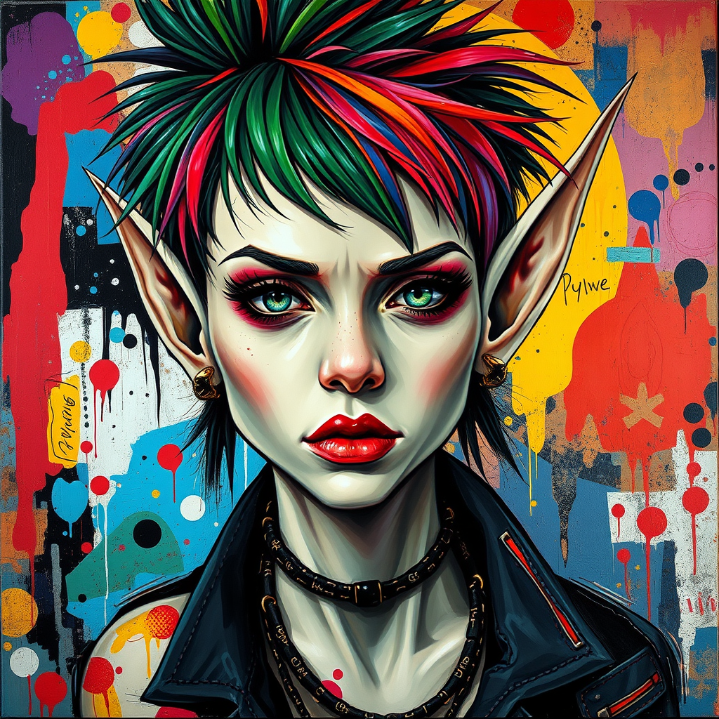 A vivid and highly detailed portrait of a punk elf, infused with neo-expressionist elements, painted on canvas. The elf exudes an edgy, rebellious vibe with vibrant, eccentric hair and striking piercings. The background is a chaotic fusion of bold colors and abstract shapes reminiscent of Julian Schnabel and Diego Rivera's styles. The canvas captures a dynamic contrast between the delicate, ethereal features of the elf and the raw, intense energy of the surrounding artwork, bringing a modern twist to fantastical elegance.