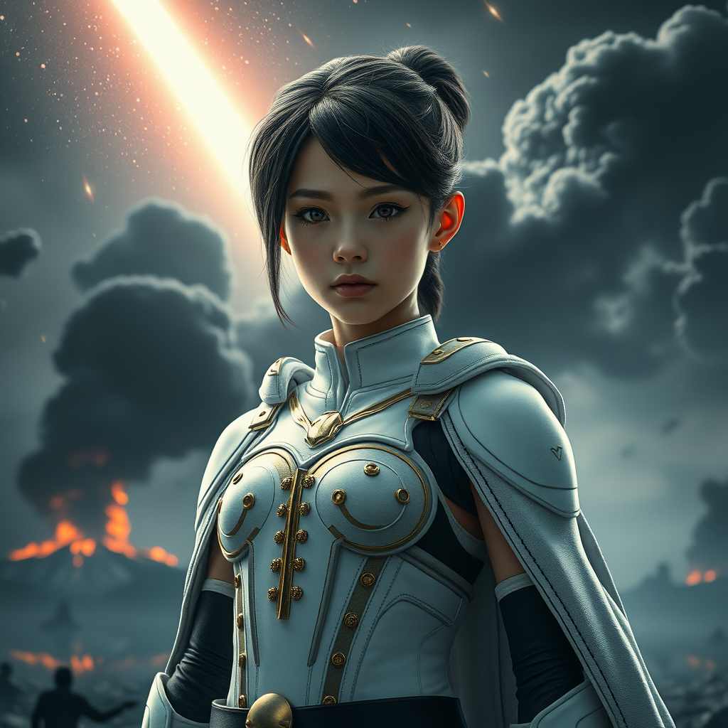 Portrait three-quarter close-up of a stunningly beautiful young girl with a slender athletic figure and an elegant face. She has an arrogant yet innocent facial expression, her hair styled uniquely. She is wearing sci-fi battle armor reminiscent of Ghost In The Shell, featuring a tight white jumpsuit with armored leggings and a dense cloak. The scene is set against a dramatic background of a meteor shower, black smoke from fires, and looming thunderclouds. Reflections of fires create a gloomy and intense atmosphere. The frame captures her from a slightly lower angle using a Canon EOS 5D Mark IV DSLR, set at f/8 aperture, with a 1/250 second shutter speed and ISO 100. The image is super detailed and hyper-realistic, featuring natural reflections and textures with cinematic lighting that emphasizes the bright, almost blinding light surrounding her. She wears a gold corset with rivets, highlighting symmetry. The image includes bare arms, neck, and chest. The scene omits any imperfections such as deformed limbs or blurred features, avoiding any signs of mutation or disfigurement, and maintains a high-quality, clear visual with natural aesthetics. No signs of watermarks, distortions, or any lower quality aspects are present. The expression of the girl remains lifelike and captivating, with no elements of oversaturation or distraction.