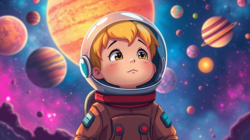 A young boy with bright blonde hair stands in an astronaut costume, gazing with wide-eyed wonder from inside his helmet at a vast space landscape filled with vibrant planets of various sizes and colors. The scene is rich with mesmerizing hues, blending deep cosmic blues with bursts of radiant magentas and oranges. The style captures the essence of Cyril Rolando's dreamlike compositions, featuring cartoony characters reminiscent of a fantastical storybook illustration. The lively details are akin to Thomas Blackshear’s dynamic artistry, punctuated with emotive expressions and intricate textures. The composition is enlivened with Tim Okamura's realistic touches, capturing the boy’s expression of awe. The image is rendered in ultra-high definition, creating an immersive and enchanting colorscape.