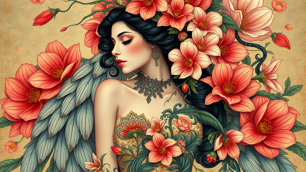 Voluptuous concubine adorned in a luxurious blend of feathers and flowers, inspired by the intricate designs of Ernst Haeckel and Maria Sibylla Merian, infused with the contemporary styles of Tristan Eaton, Victo Ngai, Artgerm, Rhads, Ross Draws, and Kaethe Butcher. Enhanced with the futuristic touch of Hajime Sorayama, Greg Tocchini, and Virgil Finlay, merging sci-fi elements with vibrant neon colors. This digital painting, designed for a high-resolution, ultra-high-definition display, draws from the aesthetic of Ilya Kuvshinov. The composition embraces unique creative reinterpretations while capturing the essence of the inspiration, ensuring a polished and visually stunning result.
