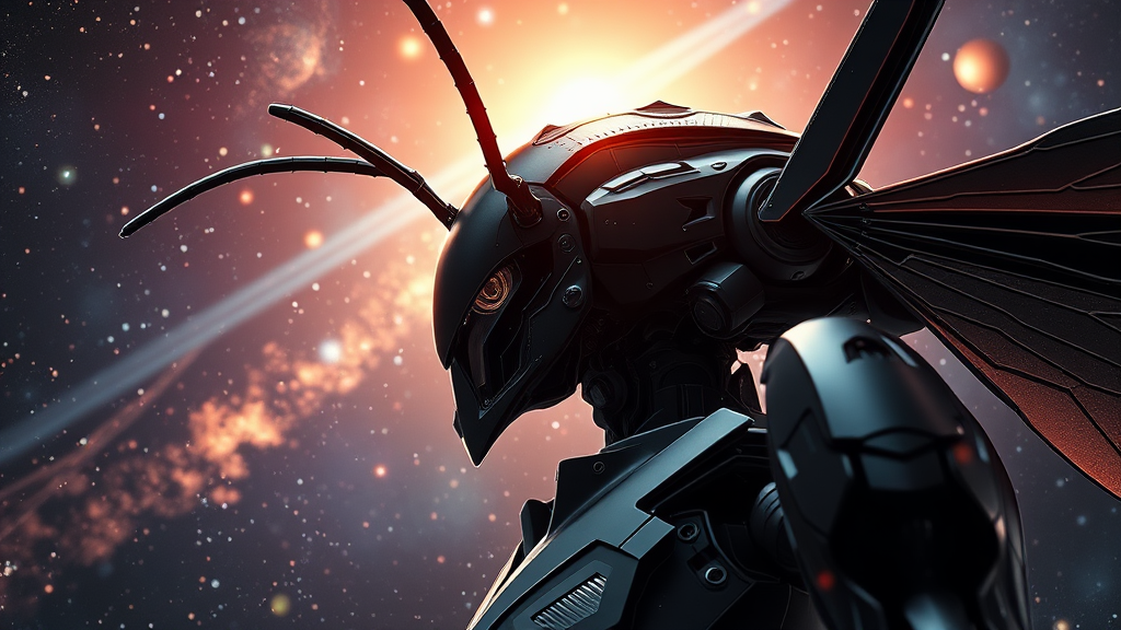 Portrait close-up of a streamlined sci-fi mech with a slender figure in three quarters view. The mech exhibits a glossy black, highly detailed insectoid design, featuring intricate sci-fi insectoid wings. Drawing inspiration from the styles of Tsutomu Nihei and Akira, it is set against a dramatic cosmic background illuminated by bright quasar light in outer space. The three-dimensional graphics merge anime art with manga drawing techniques, enhancing the scene with cosmic starlight, galaxy motifs, and vibrant plasma rays. Captured in hyper-realistic 8K UHD quality, reminiscent of being shot with a Hasselblad H4D 200MS digital camera and a Mitakon Speedmaster 65mm f/1 lens. The blend of these elements creates a futuristic and ethereal vision in the vast expanse of space.