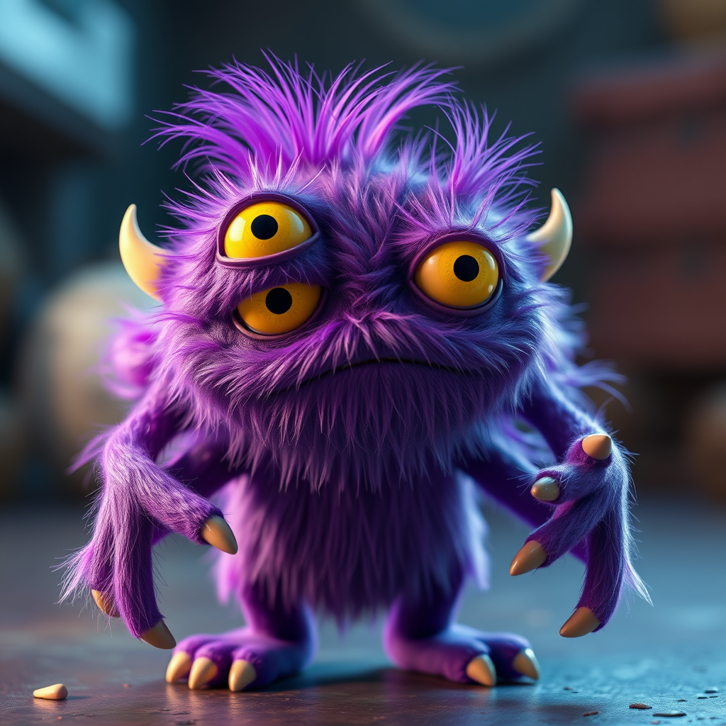 A small, cute, purple monster with realistic fur and bright yellow eyes gazes curiously around. It features two heads with playful expressions, capturing the whimsical essence of a Pixar render. Its intricate, soft-textured body is enhanced by the cinematic smoothness of an Unreal Engine 3D render, creating an engaging, lifelike appearance. The creature's design embraces a surreal charm with its extra limbs and elongated neck, drawing from a fish-eye art style for an out-of-the-frame perspective. Despite its misshapen hands and unusual anatomy, the monster exudes endearing quirkiness, inviting viewers into a world of fantasy and imagination, reminiscent of popular 3D art on ArtStation. The odd proportions, reminiscent of abstract art, carry a certain morbid curiosity, blending elements of the bizarre with the undeniably cute, set against a backdrop of vivid, yet tastefully subdued colors.