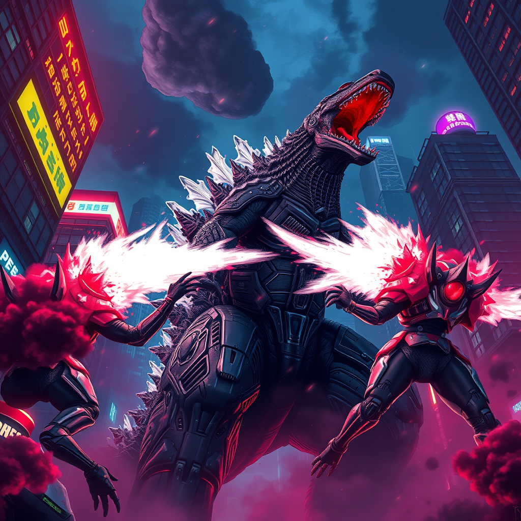 High ground angle shot capturing skyscrapers on low ground, a furious King Kong Godzilla roaring amidst futuristic organic armor-like creatures in action, emitting a powerful white and red aura as they unleash their attacks. Vibrant neon lights illuminate the scene, designed in a detailed anime style with fw Murano influences. These creatures wear full-body GALAXY armor, surrounded by plumes of jet-black smoke. The art style, inspired by Prokoko, showcases bold, expressive brushstrokes and vivid blood-red colors. With CarnageStyle intensity set at 1.6, the scene features cinematic lighting, dynamic angles, and extreme detail, creating a captivating visual spectacle.