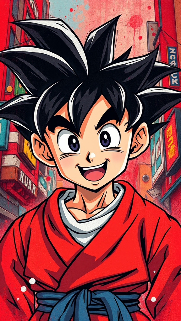 Dragon Ball-inspired, portrait of Dr. Goku in a street art aesthetic featuring cute cartoonish designs blended with photo-realistic techniques, centered around dark red hues. The composition evokes childhood arcadias with anime aesthetics and cartoon-like figures. Goku is depicted with a playful expression, surrounded by vibrant colors and dynamic urban elements, capturing a sense of nostalgia and adventure.