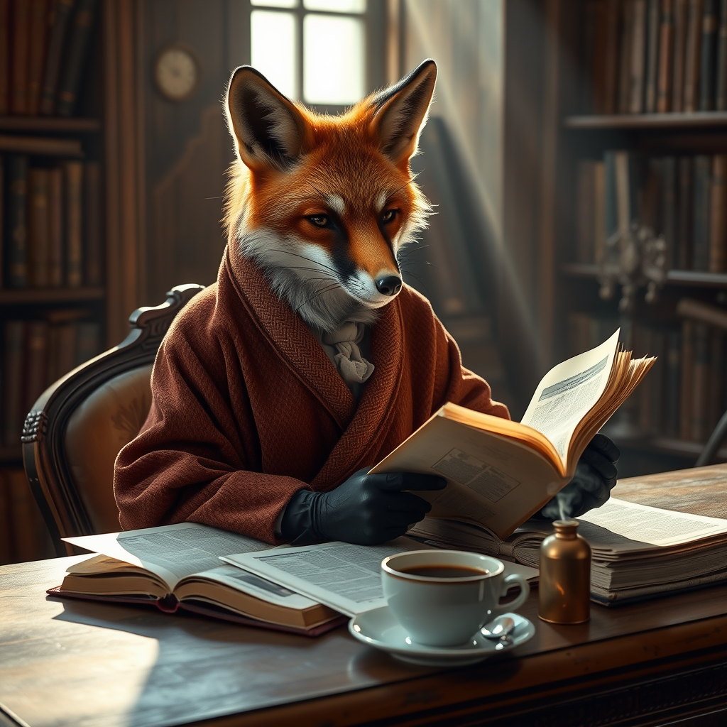 A sophisticated anthropomorphic fox seated at a wooden table immersed in a vintage book, the fox is elegantly clad in a richly textured robe. Nearby, a neatly folded newspaper hints at a penchant for current events. Sunlight filters through a dusty library, casting a warm glow on a steaming cup of morning coffee beside the fox. The scene captures a cinematic essence, blending historical elegance with the tranquil ambiance of a late morning, as if captured by an expert photographer.