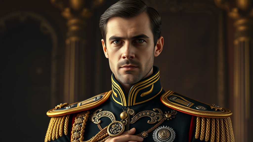 Capture a portrait of Paul Atreides in a regal and futuristic military uniform, showcasing elegance and regal authority. The scene should be realistic and detailed, with intricate and ornate design elements that blend sci-fi aesthetics. The image should be ultra-high definition, displaying rich colors and high dynamic range to emphasize depth and vibrancy. Use a model inspired by "Dark Sushi Mix - Colorful" for the portrayal. Avoid any duplication, disfigurement, or mutations. Ensure the portrait captures a clear and focused expression with natural proportions and symmetry, particularly in the face and hands. Refrain from including low-resolution elements, blurriness, jpeg artifacts, watermarks, logos, text, or any poorly drawn aspects that detract from the image's quality.