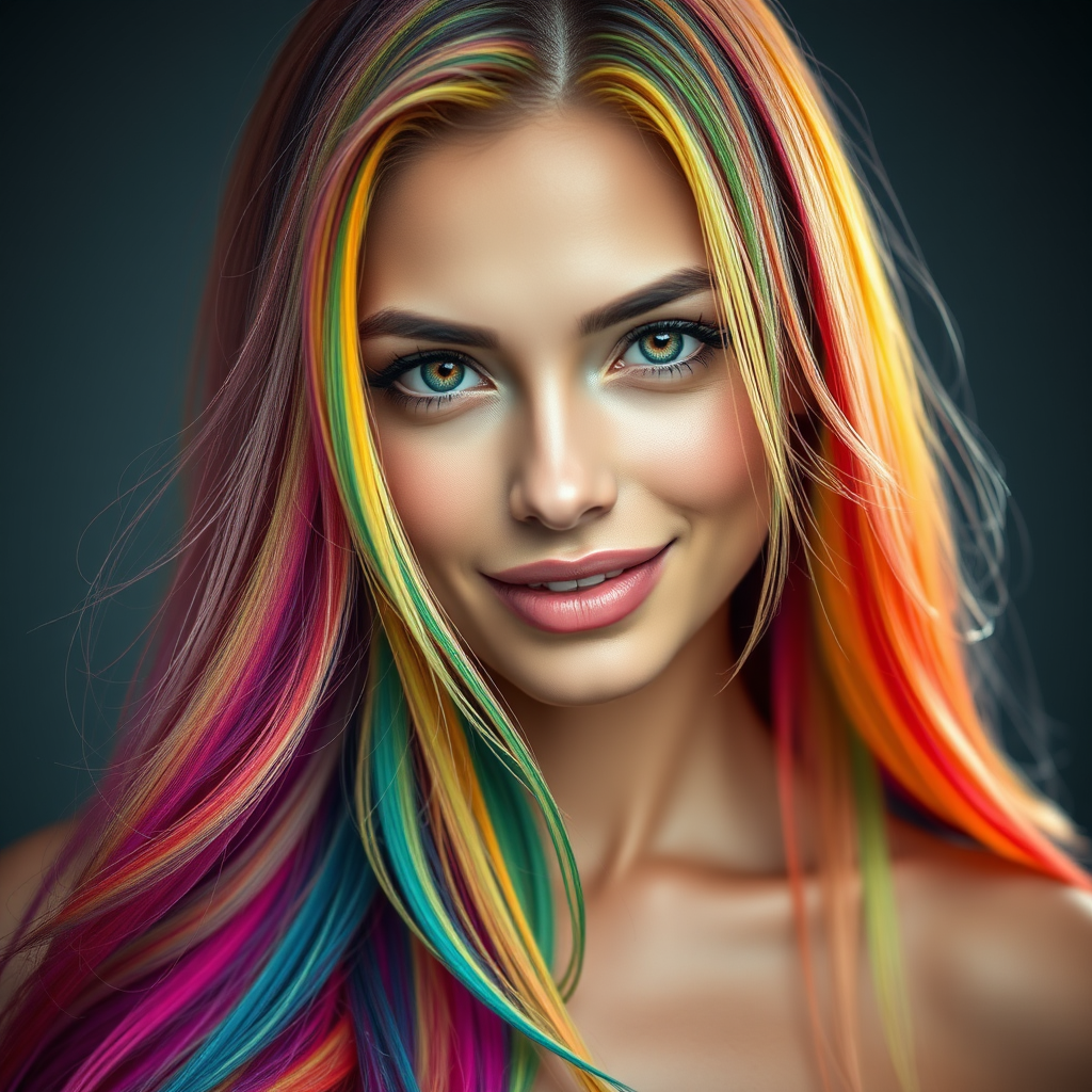 Stunning woman, vibrant long rainbow hair, striking and playful expression, portrait photography, exquisitely detailed skin, hyper-realistic, 8k resolution, finely detailed, full-body composition, high-resolution RAW color art, captivating eyes, soft diffused lighting, shallow depth of field, sharp focus, cinematic lighting, CGI influence, realistic portrayal, artistic elegance, flawless anatomy, proportional grace, seamless composition, captivating beauty, immersive realism, digital art mastery, elegance in frame, stunning visual composition, harmonious proportions.