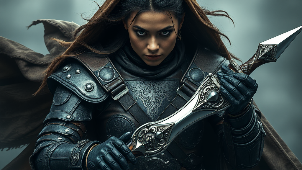 A hyper-realistic image features a formidable medieval warrior in intricately designed leather armor embellished with metallic detailing and a tattered cape flowing behind her. She is adorned with multiple straps and ornate embellishments that enhance her commanding presence. In her hands, she firmly grasps a beautifully ornamented longsword, the blade reflecting a glint of light. Around her, a misty, ethereal backdrop adds an air of mysticism and grandeur. Her intense gaze reflects a profound sense of focus and determination, her face a canvas of mystery and readiness for the impending challenge.