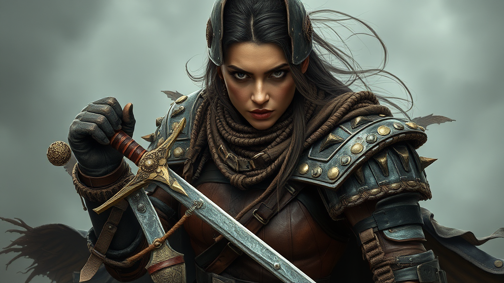 Create an ultra-realistic image of a fierce medieval warrior adorned in intricate leather armor with metallic accents, and a tattered cloak flowing behind her. Her attire is accentuated with various straps and embellishments. She grips a long sword with an ornate hilt, exuding strength and determination. The background is enveloped in a thick haze, creating a mystical and epic atmosphere. Her face is intense and focused, adding an element of intrigue and readiness for an impending challenge.