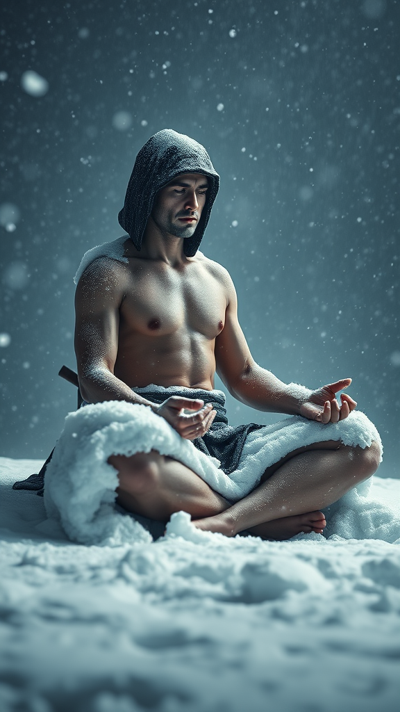 In a hyper-realistic, cinematic scene, a lone ninja sits in deep meditation amidst a fierce blizzard, his body partially sheltered by layers of accumulating snow. Clad only in traditional Japanese fundoshi, his exposed skin bears the frosty touch of the freezing air, yet he remains composed and serene. Positioned cross-legged with hands gently placed on his knees, the ninja remains undisturbed by the relentless snowfall and winds that whip around him. The snow piles gradually on his shoulders, arms, and legs, highlighting the stark contrast between his bare skin and the snow-laden landscape. His skin shimmers with frost, exuding a quiet but formidable inner strength, untouched by the icy conditions. The blizzard's tumult is palpable, with swirling snow and ice particles carried by fierce gusts, yet the ninja's tranquility makes the storm seem distant. His breath is scarcely visible in the biting air, an indication of his profound spiritual focus. Beams of volumetric light pierce the storm, casting soft, ethereal glows upon the ninja and the snowy ground, as the light catches swirling snowflakes, creating a stunning, dreamlike ambiance. The blizzard's chaos contrasts sharply with the ninja's unwavering stillness. The scene is enveloped in a color palette of pale blues, whites, and icy grays, reinforcing the environment's harshness and the ninja's solitude. His minimal appearance, clad solely in a traditional fundoshi, enhances the sense of peace amidst the chaos, as though transcending the physical realm and becoming one with the elements surrounding him.