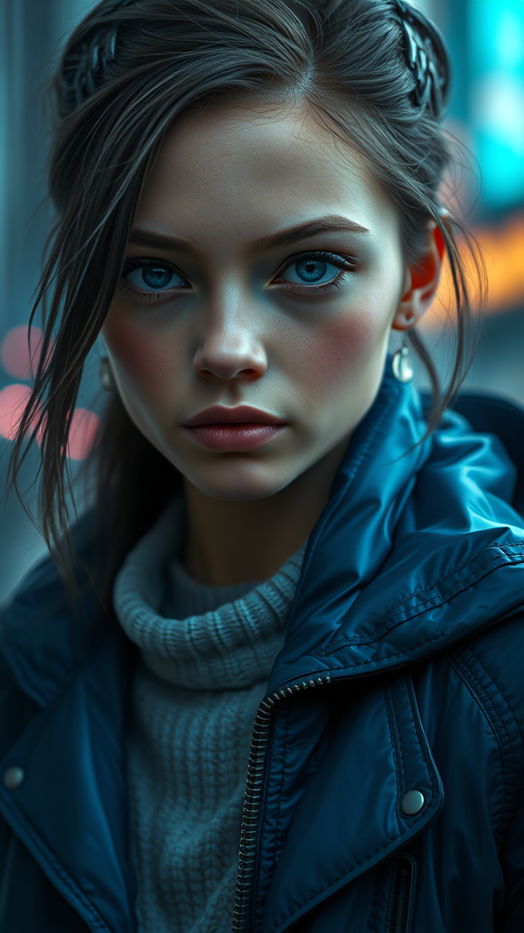 A detailed portrait of a European pretty young girl wearing a storm rain movie jacket coat, featuring futuristic sci-fi fashion elements and royal attire influences. Inspired by Ismail Inceoglu, Dragan Bibin, Hans Thoma, Greg Rutkowski, Alexandros Pyromallis, Nekro, and Rene Magritte, the image showcases a perfect face with a sharp chin and fine details. The portrait presents a cyberpunk, neotokyo, synth-wave aesthetic, with a backdrop reminiscent of a Bladerunner movie scene, highlighting dramatic lighting. The color palette is rich and vibrant, utilizing high detail RAW colors and achieving ultra-high resolution through physics-based rendering, resulting in hyper-realistic lifelike textures. The photography is professional, using an f1.6 lens to capture hyper-realistic detail. The scene evokes a sense of realism and high contrast, maintaining a cinematic feel with no sharpness reduction or low-resolution elements. The digital art blends CGI, illustration, and digital painting techniques without the flaws of overly cartoony or caricatured styles, focusing instead on the fusion of a lifelike appearance with futuristic fashion.