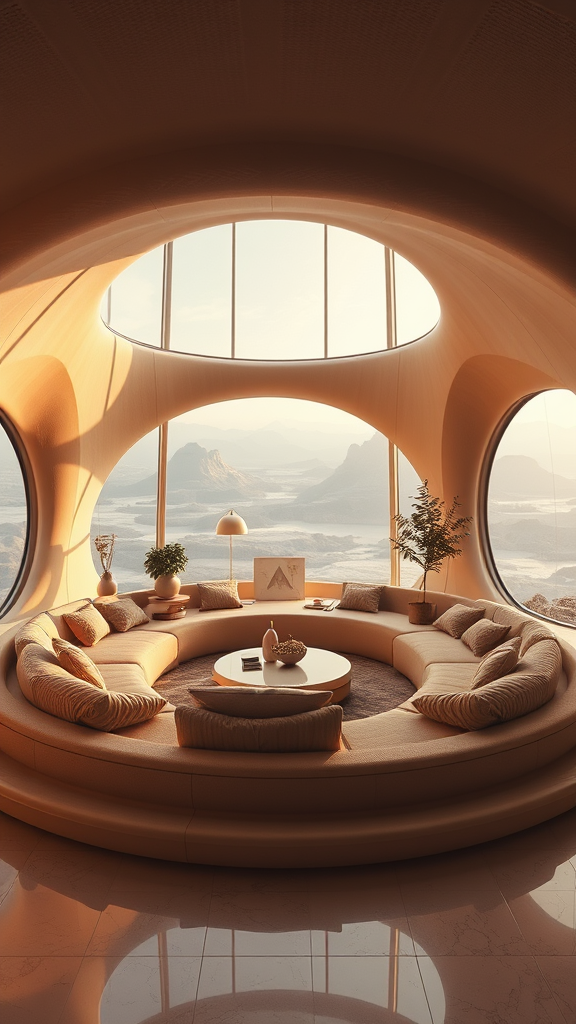 A mesmerizing 3D render of a sunken living room conversation pit from the 70s, envisioned in a retrofuturism style. The architecture features sweeping, organic lines and subtle curves that create an inviting and intimate ambiance. The space is bathed in warm, neutral beige tones, enhancing its cozy atmosphere. Soft, plush seating encircles a low central table, complemented by a blend of vintage and futuristic decor elements. Large, panoramic windows offer ethereal views to an imaginary landscape, blurring the lines between indoors and outdoors. An intricate play of light and shadow adds depth, while the dreamy, otherworldly textures suggest a space where time stands still.