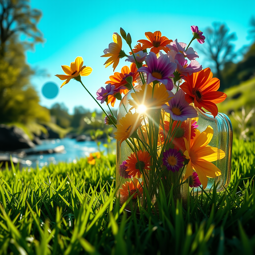 A vibrant arrangement of colorful flowers inside a transparent bottle resting on lush green grass, with sunlight breaking through the glass, creating a kaleidoscope of colors. It's a sunny spring day under a clear blue sky, with the scene captured in exquisite detail and sharp focus, evoking a professional cinematic experience in 8k UHD. A dark, dramatic river flows nearby, adding a nervous edge to the otherwise serene setting. Rendered with HDR CGI in 3D, this imagery captures the essence of vibrant nature with a hint of underlying tension, yet avoiding any elements that detract from its beauty and realism.