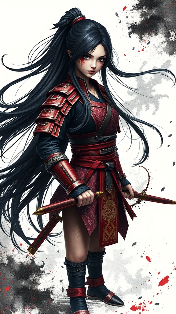 A striking female warrior stands alone in an ultra-detailed, hyper-realistic 32k wallpaper. Her long, black hair floats around her, contrasting against a pristine white background. Intense black eyes lock onto the viewer with a fierce gaze, hinting at her formidable strength. She wears protective arm guards and intricately designed red armor with hints of blood smeared across her face, suggesting recent battle victories. Her feet are clad in traditional tabi, grounding her in a stance of readiness. The background is an abstract masterpiece, blending fractal art with elements reminiscent of an ink wash painting, creating a surreal environment that enhances her striking presence. This CG unity artwork is rendered in ultra-high-definition, capturing even the finest details of her character and surroundings with astonishing clarity.