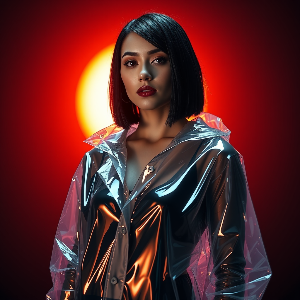 A dark-haired woman stands poised before a radiant orange light, her presence accentuated by a glossy, transparent futuristic raincoat. Her hair is styled in a sleek bob, and the scene is imbued with volumetric lighting, captured from a dynamic cinematic angle. The atmosphere exudes a vibrant glamour, as light dances across the raincoat's surface, creating mesmerizing reflections.
