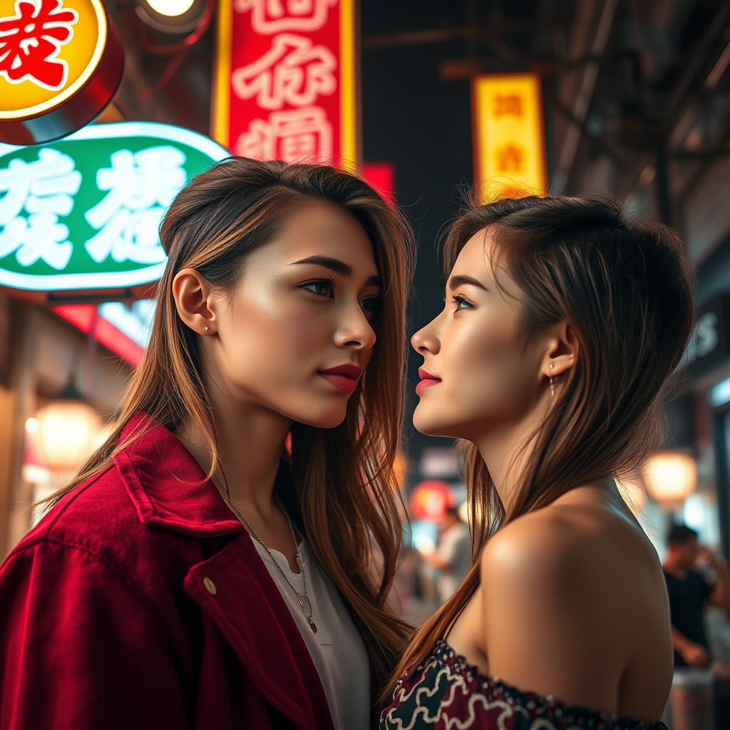 Realistic portrait of a stunning young couple in an Asian market setting, the girl and boy gazing intently into each other's eyes, sharing a romantic moment amidst neon shop signs and the glow of night city lights. Both have striking features: vibrant green eyes, flawless symmetrical faces, and perfectly toned physiques. The girl, a supermodel, boasts long, flowing hair reminiscent of ink, adorned with delicate makeup that highlights her beautiful freckles and high cheekbones. Her expressive doe eyes carry a hint of melancholy. The boy mirrors her elegance with an equally photogenic appearance and aura. The scene is captured in ultra-high definition with cinematic lights, using aperture 1.8 to create a soft bokeh effect and subtle lens flare, enhancing the extra-dimensional quality of the moment. The ambiance around them is electric, filled with vibrant neon hues and intricate details, encapsulating the bustling and vivid life of the market.