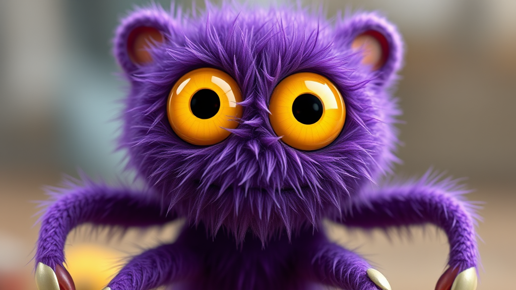 A whimsical, petite, purple fuzzy creature with bright yellow eyes, rendered in 3D using Unreal Engine. ArtStation trending quality with realistic fur, featuring fish-eye lens effect and charmingly large reflective eyes, reminiscent of a Pixar interpretation. Intricately detailed with two heads and faces, the creature is partially cropped, adding mystery. Its anatomy includes long necks, twisted fingers, and an unusual mixture of extra limbs, creating a surreal appearance. Despite being cute, the overlapping limbs and blurred areas lend it a quirky, abstract charm. The rendering captures a dreamlike, animated toy-like figure with an imaginative twist, evoking a sense of wonder and curiosity.