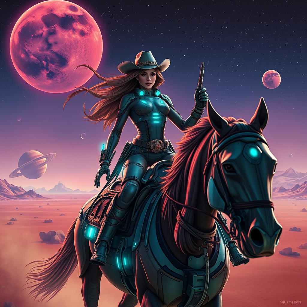 A stunning space cowgirl with flowing hair, wearing a sleek futuristic cowboy outfit adorned with glowing neon details, confidently rides a biomechanical horse through a dramatic alien desert landscape. The wild west sci-fi setting showcases distant planets and stars in the vivid night sky. The scene captures an ultra-detailed and realistic aesthetic, highlighting the intricate textures of her attire and the horse's metallic features. The atmosphere is a perfect blend of traditional western and advanced space age era elements, creating a captivating and unforgettable photographic moment in 8k resolution.