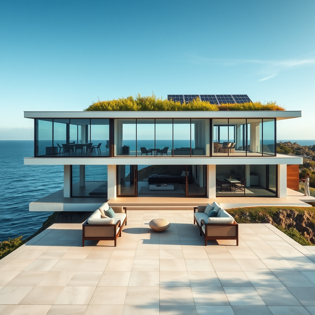 Hyper realistic photo of a mid-century modern house at eye level, featuring expansive glass windows and clean geometric lines, situated on a cliff with a breathtaking view of the ocean. Bathed in the soft, indirect daylight typical of an architectural shoot for an esteemed design magazine. The design harmoniously blends elements inspired by Frank Lloyd Wright, Charles and Ray Eames, and Mies van der Rohe, with an inventive twist of including vibrant greenery on the rooftop and sleek solar panels. The foreground shows a minimalist patio with understated yet elegant furniture, allowing for an uninterrupted view of the serene seascape.