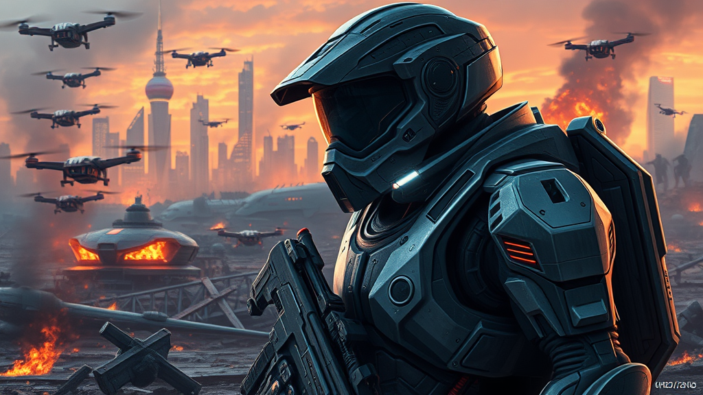 UHD Dynamic Lighting Detailed Sci-Fi Futuristic Soldier equipped with cutting-edge armor and advanced weaponry, featuring a sleek visor, poised on a war-ravaged battlefield surrounded by hovering drones and smoldering remains, with a futuristic city skyline looming in the distance, digital painting.