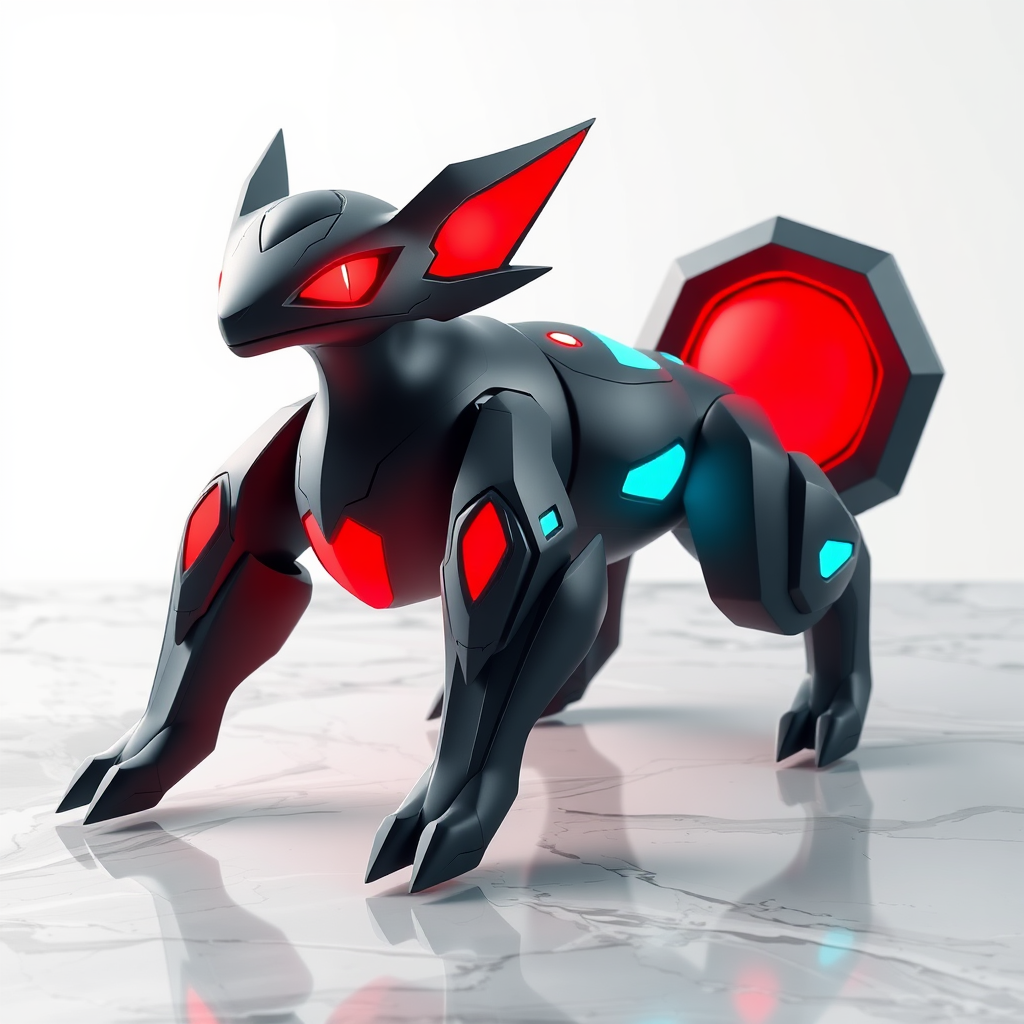 A stunning quadrupedal Pokemon with a sleek, stylized 3D appearance stands on a smooth, luxurious marble surface. Its glowing, ruby red eyes shine with an inner light. The creature, imbued with a scifi aesthetic, features majestic light blue granite accents that hint at its powerful nature. The scene is set against a simple, pristine white background, enhanced by chromatic aberration to give a subtle, dynamic contrast. The overall composition is elegant and well-balanced, highlighting the beauty of this unique creature without unnecessary embellishments or distractions. Its form is perfectly proportioned, capturing an essence of otherworldly grace.
