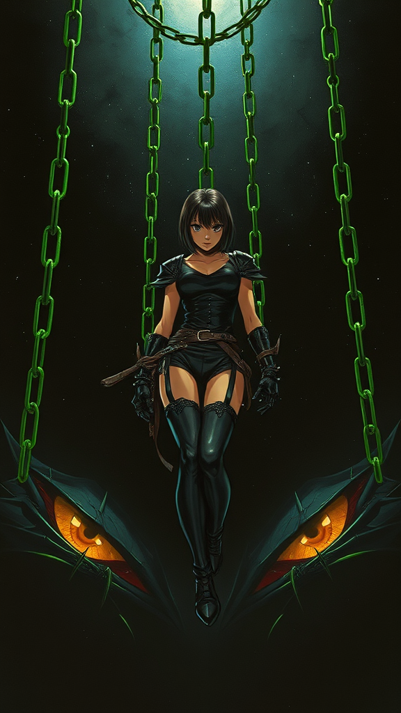 A grainy 90s dark fantasy anime scene shows a striking young woman with a well-defined figure, her dark armor and leather attire contrasting against vibrant acid green chains anchoring her from the edges of the frame. She is suspended gracefully in the center of an apocalyptic black cosmos, where bright, ominous eyes peer at her from the shadows. The rich texture of the scene evokes the classic styles of Cowboy Bebop, Evangelion, and Berserk, capturing a sense of timeless tension and haunting beauty.