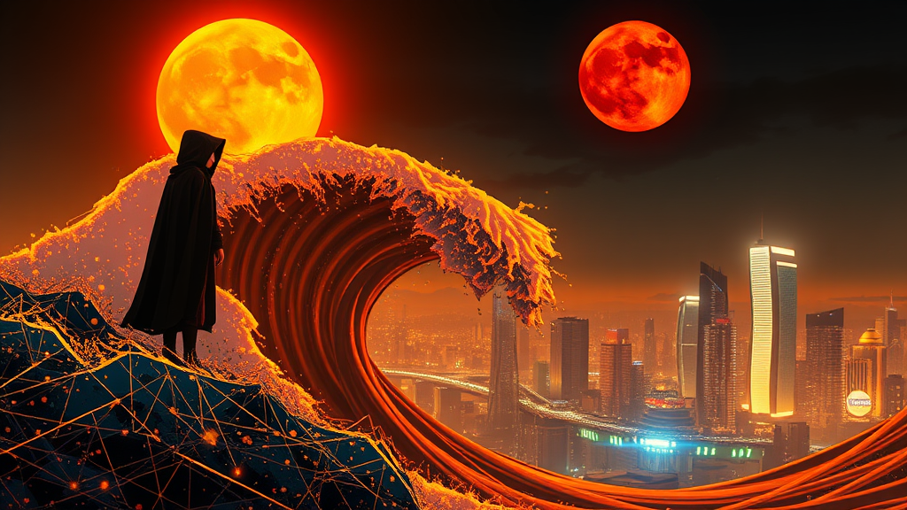 Masterpiece, best quality, a golden sea wave, bright orange sunset through the wave, shimmering golden water droplets, 1 girl standing on a ledge overlooking a vibrant cityscape at night, stylized urban fantasy art, hooded Sith Lord, digital cyberpunk anime aesthetics, blood moon casting a vivid glow, adorned in a futuristic hooded cloak, digital cyberpunk - anime fusion, modern science fiction anime style, dark cyberpunk illustration featuring an anime cyberpunk girl with a hood under the blood moon, rendered with Unreal Engine, depicting a sky with intricate patterns of break and fracture, hyper-realistic details capturing the essence of modern materials, dramatic lighting enhancing the scene, Unreal Engine art bringing the concept to life with immersive visuals and textures.