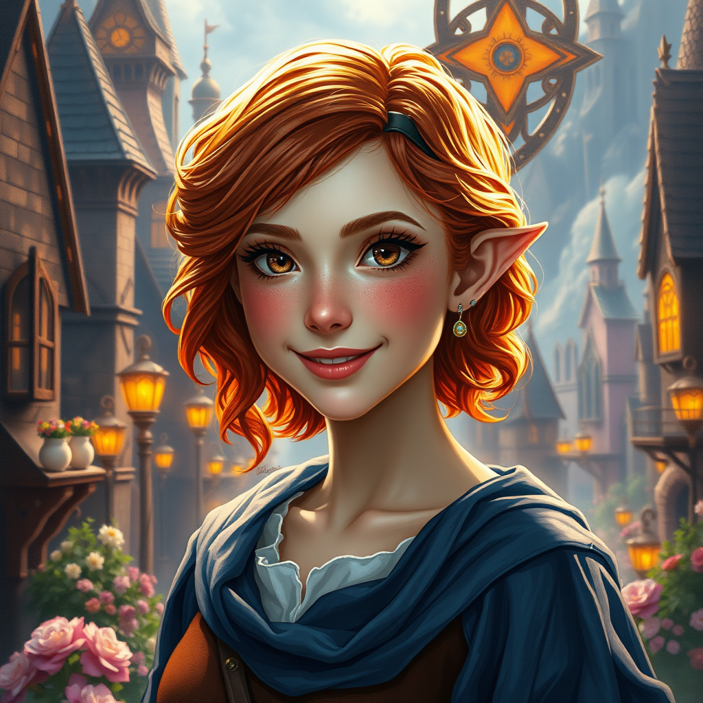 A captivating oil painting depicting a D&D fantasy character with freckles and a slender, beautiful physique. The character features short, fiery red wavy hair and a radiant smile, with mesmerizing pointed ears that capture the viewer’s attention. Her enchanting 8k eyes, reflecting the golden ratio, exhibit big, anime-inspired dreaminess. She is a cleric adorned in a meticulously detailed adventurer outfit, surrounded by an intricately hyper-detailed and breathtakingly colorful medieval city that serves as a glamorous backdrop. The scene is immersed in a dramatic mix of deep and ambient lighting, highlighting the hyper-focused, ultra-fine details of her face and the luminous play of light on her hair. Vibrant complementary colors enhance the cinematic feel of this concept art, as god rays and volumetric lighting provide a touch of ethereal beauty. The setting is enriched with flowers and a picturesque garden, exuding an atmosphere of serene wonder, where the character stands as a top model explorer amidst an Unrealistic Dream-like landscape, captured with an octane render for a truly immersive visual experience.