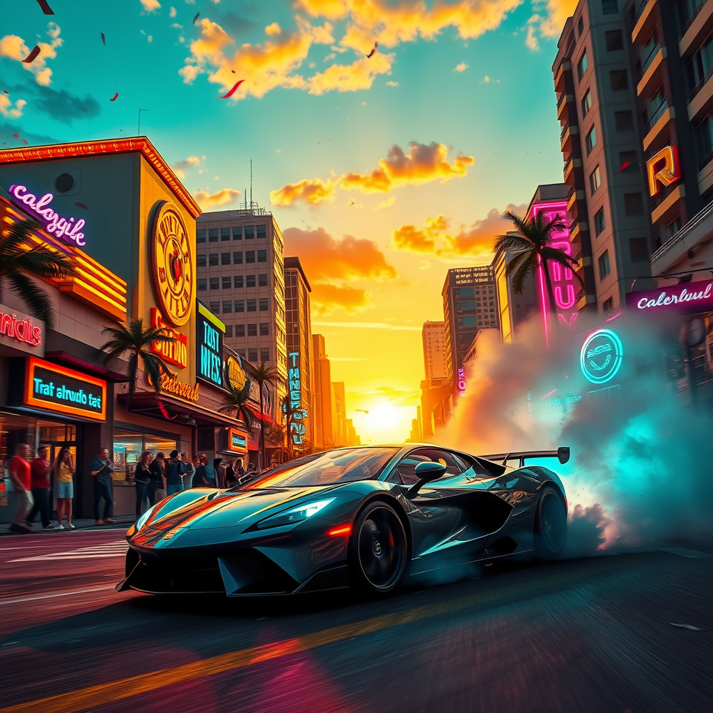 A vibrant and sunny day with a stunning sky transitioning into sunset, a sleek sports car races through the bustling and neon-lit streets of a cyberpunk Miami. The city is alive with colorful neon signs flickering and animated crowds cheering as confetti and debris swirl around in the gusty wind. Volumetric fog adds a mystique to the scene, enhancing the cinematic feel of this exhilarating epic action, captured with dynamic camera movements.