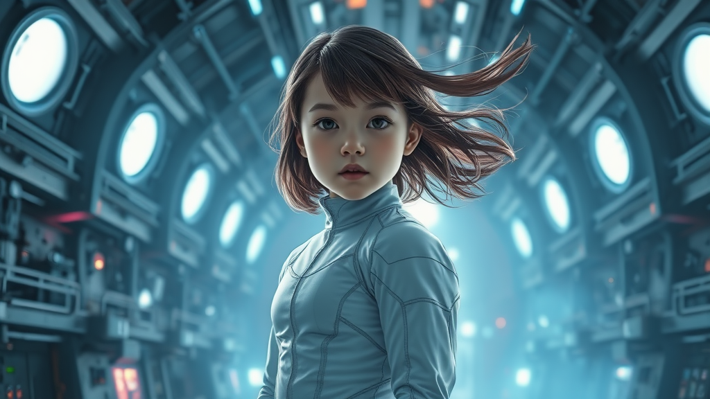 A young girl in a white, tight-fitting sci-fi jumpsuit is inside a spaceship, embodying a cyberpunk essence. Her hair, influenced by futuristic stylization, flutters in a cold, gloomy room filled with intricate graphics and an anime aesthetic. The environment showcases gigantism with multi-storey spaces and muted colors, illuminated by blue and bright lumens from one angle, casting sharp shadows and creating a blurred background. The scene is rich in sci-fi elements, featuring hyper-detail and clumps of energy that occasionally flash with light. The girl has a cold look, observed from a third-person perspective in a portrait setting. Round illuminations and elements punctuate the space, adding complexity and depth. The visual narrative embraces a futuristic style marked by sharp angles and fine details. Despite the mechanical and otherworldly feel, subtle creative touches balance the environment's harshness with hints of organic distortion and design, maintaining the core concept while exploring the limits of visual mutation and blend.