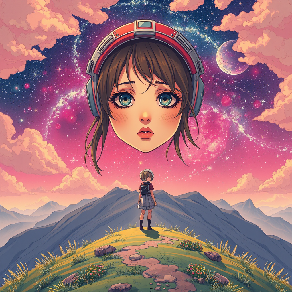 Space girl standing alone on a hill, centered with a detailed gorgeous face in anime style, featuring intricate and breathtaking details. The scene is vibrant and panoramic with a cinematic feel, inspired by the works of Carne Griffiths, Conrad Roset, and Studio Ghibli, capturing a key visual essence.