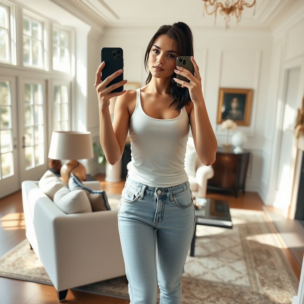 Koh_KendallJenner in a white tank top and classic blue jeans, casually posed in a sunlit living room capturing a selfie, surrounded by elegant decor and soft, natural light filtering through large windows.