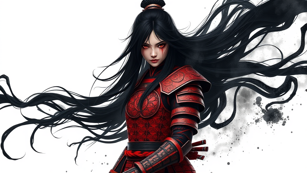 A lone warrior with long, flowing black hair gazes intensely at the viewer, her eyes as dark as onyx. She stands poised against a minimalist white background, her presence commanding attention. Her face bears smudges of blood, hinting at recent battles, while her form is sheathed in intricately designed red armor, resembling a masterpiece of fractal art. An aura of elegance and power emanates from her, enhanced by arm guards and traditional tabi footwear. Her hair appears to float as if suspended in a gentle current, adding an ethereal quality to her stance. The abstract backdrop is reminiscent of an ink wash painting, providing a rich tapestry that blends seamlessly into an extremely detailed CG style, capturing every nuance in ultra-realistic 32k resolution. This stunning imagery manifests as an exquisite 8k wallpaper, showcasing the highest quality and artistry.