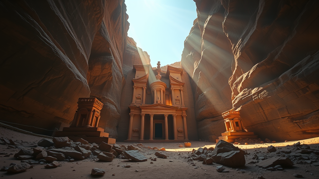 A forgotten Sumerian Temple, nestled within the rugged walls of a secluded canyon, debris from ancient times scattered near its entrance. The arid desert landscape surrounds the temple, while beams of sunlight pierce through the dark canyon, illuminating the scene with a dramatic, cinematic flair reminiscent of Petra. Volumetric lighting accentuates the majestic ruin, offering a stunning 16k UHD HDR view. The atmosphere is both mysterious and awe-inspiring, capturing the essence of a hidden world lost to time. The intricate carvings and architectural details hint at a once-flourishing civilization, now left to the elements.