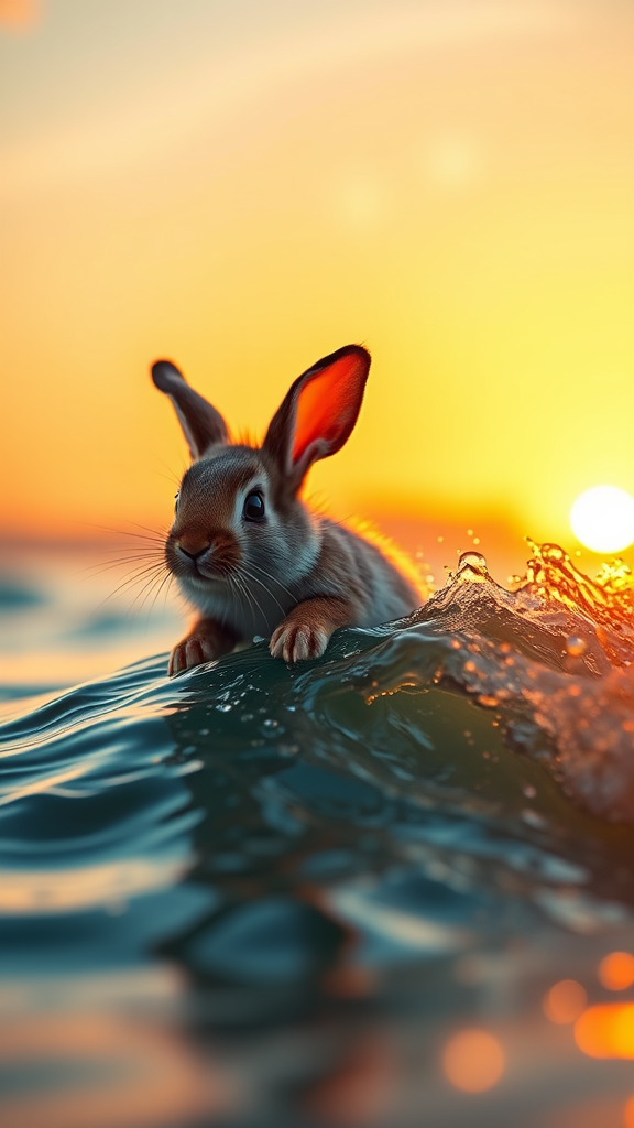 Photorealistic 32k image of a tiny baby bunny riding the crest of a wave with remarkable grace, illuminated by warm, cinematic sunset lighting that casts a golden glow across the scene, the vibrant colors of the setting sun reflecting on the water's surface, highlighting the bunny's fluffy fur and creating a magical, serene atmosphere.