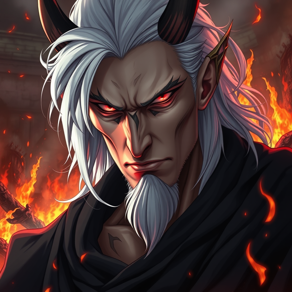 UHD, 164k, highly detailed face, anime demon mature man with dark robe, full body pan view, masterpiece, hyperdetailed masculine face and nose, complete body perspective, ideal physique, perfect anatomy, intricately detailed face, flowing white hair, piercing red eyes, alabaster skin, standing amidst a fiery hellscape, illustration, hyperrealistic, vivid environment, dynamic pose, strong presence, unique character design, ethereal aura, menacing elegance, sharp gaze, intense expression, flames, shadows, smokey atmosphere, artful composition, engaging storytelling element.