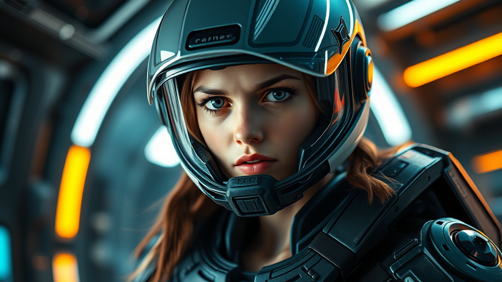 A full portrait close-up with a three-quarter focus featuring a captivating face with a frowning yet innocent expression. The slender, athletic figure of a girl is captured in a dynamic action pose with expressive details highlighting her form. She is clad in a combat exo-armor suit, which includes a closed breathing system and a sleek sci-fi cosmic helmet. The high-tech, glossy transparent visor is accentuated by cinematic helmet lighting. The scene is set within a detailed, futuristic interior reminiscent of the series "The Expanse," enriched with neon and volumetric lighting that provides an inner glow. The photograph is taken using a Canon EOS 5D Mark IV DSLR with a meticulous depth of field, yielding a hyper-photorealistic result. Light reflects naturally upon elements such as the cinematic lighting of hair tails, a bare neck, and tinted glass. A dynamic composition with a focus on symmetry and realistic rendering brings the character to life, avoiding any undesired distortions or abstract qualities.