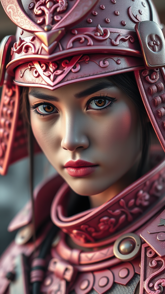 3D render, a fierce woman clad in intricate pink samurai armor, her eyes focused and determined, close-up shot, the texture of the metal reflecting a soft glow, subtle cherry blossom patterns etched into the armor, delicate strands of hair peeking from beneath her helmet, background hints of a traditional Japanese landscape, ratio 9:16, raw and vivid detail.