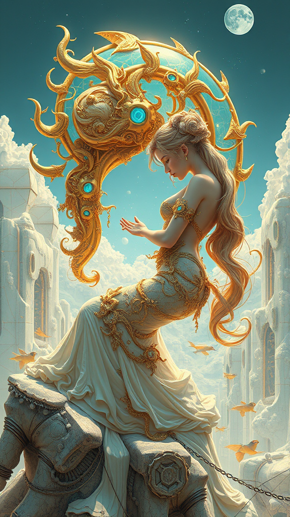Christiano V's hyper-realistic sci-fi illustrations capture the essence of romantic fantasy, drawing inspiration from the surreal and intricate style of Franciszek Starowieyski. In a palette of shimmering gold and vibrant cyan, these artworks intertwine organic sculpting with futuristic themes. The compositions reflect an ethereal blend of romanticism and technology, reminiscent of Android Jones' digital mastery. Scenes are alive with emotion, featuring otherworldly landscapes and intricate character designs that blur the line between reality and imagination, embodying a timeless, dreamlike quality with a subtle futuristic edge.