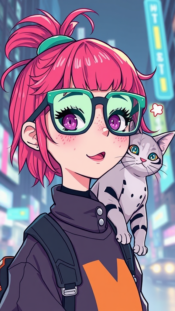 An illustration of a quirky girl with vibrant pink hair styled in a whimsical fashion, featuring prominent freckles scattered across her face. She has a playful, futuristic style, inspired by the cyberpunk genre, blending traditional and modern elements. The girl wears oversized glasses with a neon pastel green tint that reflect the glow of city lights. A curious cat with robotic features rests on her shoulder, adding a touch of futuristic charm. The scene is captured in a flat shading technique reminiscent of Gemma Correll, emphasizing bold lines and simple shapes. The background subtly hints at a bustling, neon-lit urban landscape, enhancing the cyberpunk ambiance. The girl's attire combines elements of street fashion with high-tech accessories, keeping the core concept intact while infusing it with a creative twist.