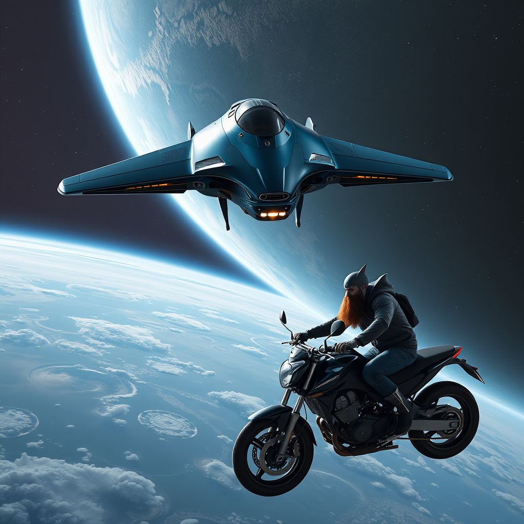 Photo of a dark blue spaceship in a weightless state, approaching a space station against a backdrop of sky, stars, and Earth from space. Features an awe-inspiring composition with 8k resolution showcasing insane details in a photorealistic manner. The spaceship design is inspired by Ezequiel Montalt, featuring sleek lines and advanced technology. Nearby, two figures resembling Ironman bikers with futuristic helmets ride motorbikes, showcasing unique features like a long beard, pointed footwear, and innovative accessories. The scene blends elements of fantasy and reality, highlighting creativity and the vastness of space.